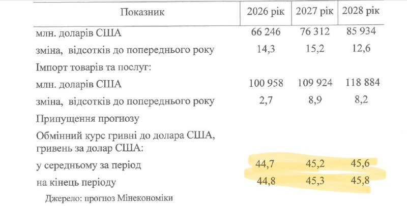 Кабинет министров прогнозирует, что в ближайшие три года доллар не будет резко дорожать по отношению к гривне. Средний курс доллара на 2026 год заложен на уровне 44,7 гривен, на 2027-й - 45,2 гривны, на 2028-й - 45,6 гривны.