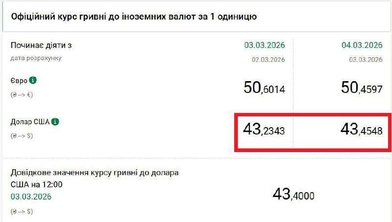 Регулятор поднял максимальный курс межбанка до 43,6250 грн/$, а минимальный составляет 43,35 грн/$. Это выше вчерашнего 43,3 грн/$, а также показателя 43,1 грн/$, который был перед началом войны в Иране. А по итогам безналичных торгов НБУ поднял свой официальный курс гривна/доллар со вчерашних 43,2343 грн/$ до 43,4548 грн/$.