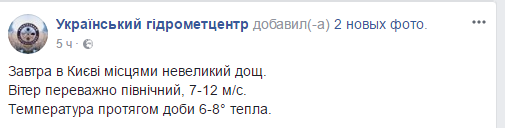 Как говорится в сообщении на странице Украинского гидрометеорологического центра в Facebook, во вторник ветер в столице ожидается преимущественно северный, 7-12 м/с.