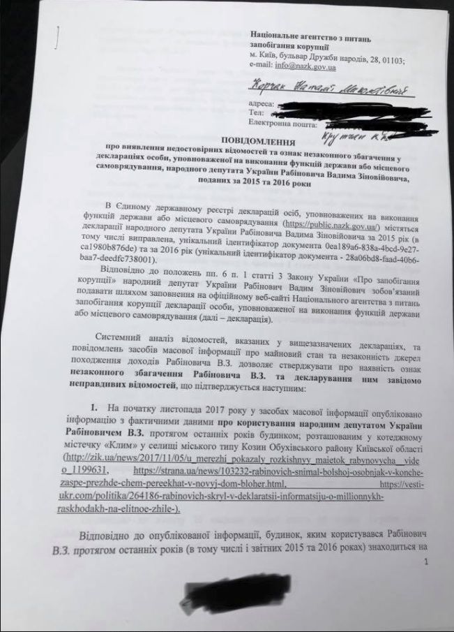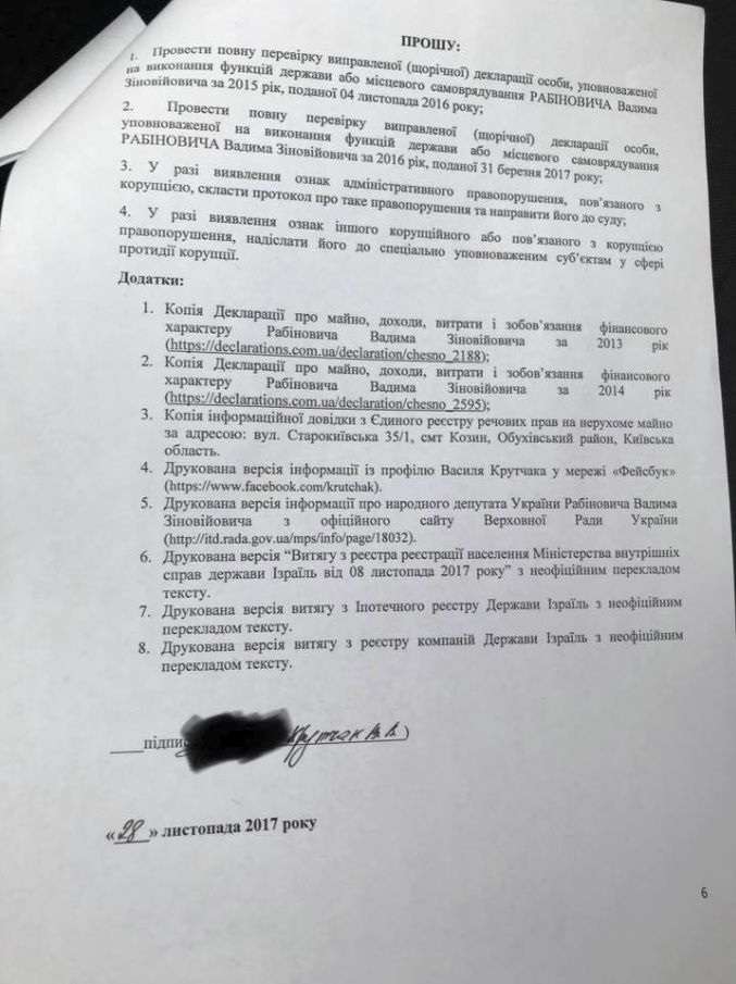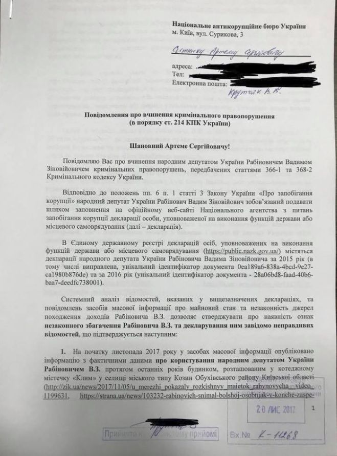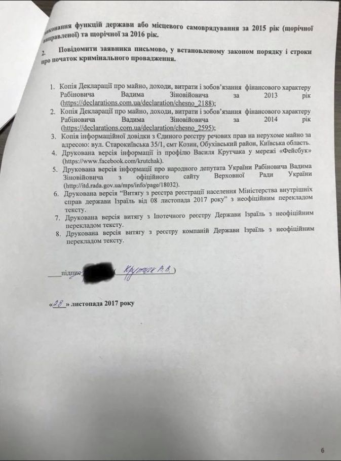 Ранее обвиненный депутатом Верховной рады Украины Вадимом Рабиновичем в покушении журналист и блогер Василий Крутчак подал в Национальное антикоррупционное бюро Украины (НАБУ) заявление о фальсификации Рабиновичем своих налоговых деклараций.