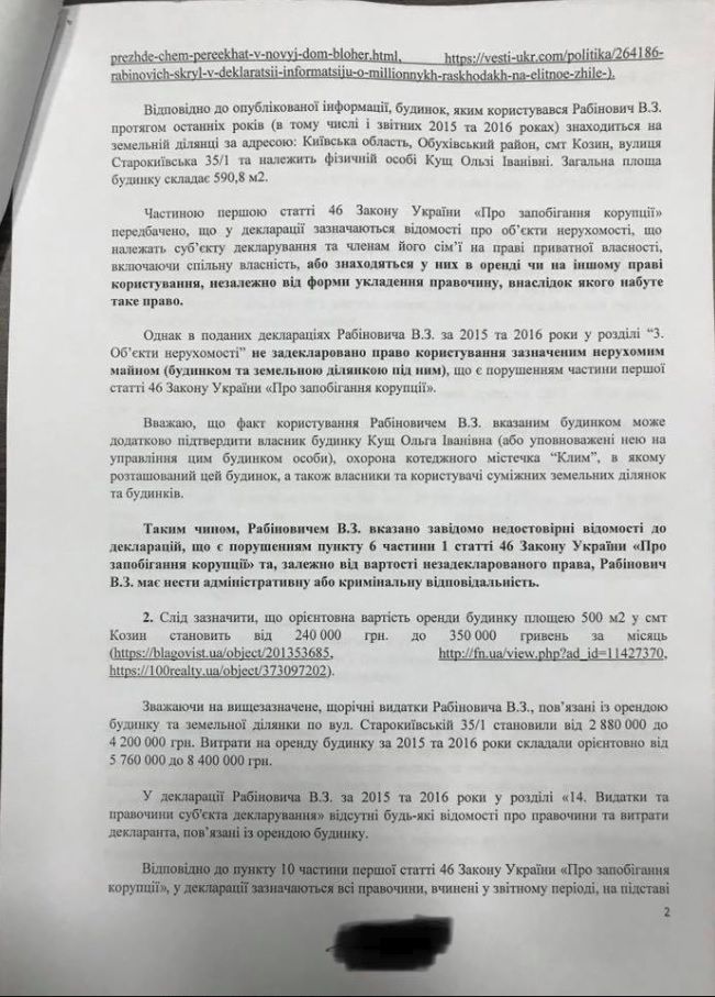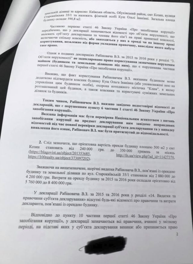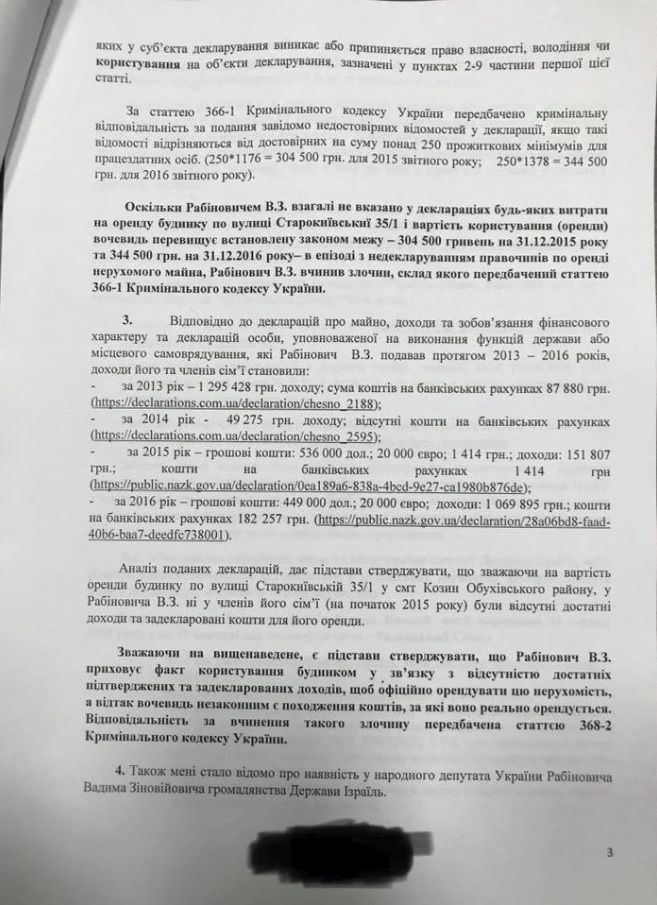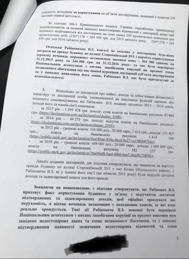 В опубликованных Крутчаком копиях документов идет речь о том, что Вадим Рабинович не стал указывать в своих декларациях о доходах за 2015 и 2016 годы дом в Обухове площадью 600 кв. м, который якобы арендует депутат. При этом, расходы на аренду подобного строения в подобном районе за 2 года, по подсчетам Крутчака, составляют от 5,8 до 8,4 млн гривен.