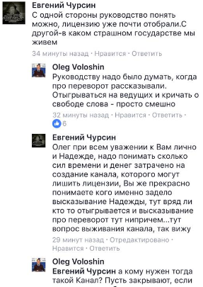 Под постом Надежды Сасс развернулась дискуссия. Одни пользователи считают, что это нарушение свободы слова, о защите которой говорит канал, который сам неоднократно подвергался давлению со стороны власти и радикалов.