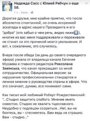 "Дорогие друзья, мне крайне приятно, что после абсолютно спонтанной, но очень искренней эскапады в адрес нашего Президента и его "добра", многие из вас меня поддерживали и переживали не станет ли это причиной моего увольнения. И вот, к сожалению, это случилось", - написала Сасс.