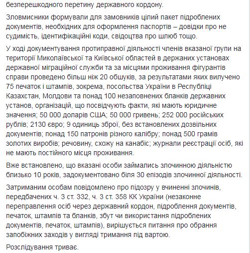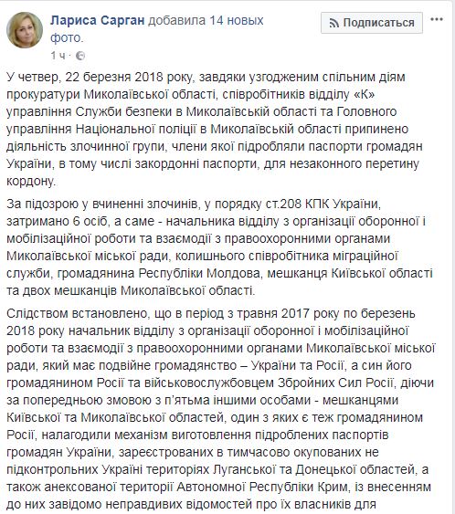 В период с мая 2017 по март 2018 года чиновник городского совета, у которого выявили гражданства Украины и России, а сын его является гражданином России и военнослужащим вооруженных сил России, в сговоре с пятью жителями Киевской и Николаевской областей, один из которых тоже является гражданином России, наладили механизм подделки паспортов граждан Украины, зарегистрированных в так называемых "ЛДНР" и Крыму.