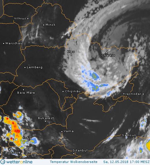 "Сравниваем два спутниковых фото. Первое сделанное утром, второе - вот вечером. Я уже говорила о движении циклона против часовой стрелки. Хорошо видно, что утром циклон закрывал только восточную нашу часть, а сейчас уже вывернулся до Киевщины на западе и зацепил Крым на юге", обращает внимание синоптик.