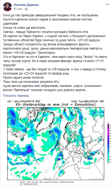 "Завтра - Успение и начало молодого бабьего лета. 28 августа на юге Украины, в восточной части, в большинстве центральных и северных областей будет солнечно и очень тепло, + 27 + 33 градуса. Западные области попадут под влияние атмосферного фронта - кратковременные дожди, грозы, дневная максимальная температура воздуха в пределах + 18 + 24 градуса. Прохладно. Кто в Карпатах или кто в Карпаты - уже стоит иметь какие-то "флисы" и даже легкую пуховую куртку. Потому что в горах местами вечером, утром и ночью +7 +11 градусов! В Киеве завтра еще без осадков и +29 градусов. А вот в среду в столице похолодает до + 22 + 24 градусов и пройдет дождь. Однако в дальнейшем снова потеплеет", - сообщила Наталья Диденко на своей странице в соцсети.