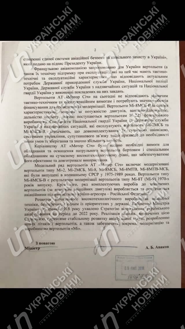 "Вертолеты АТ "Мотор Сич" на сегодняшний день не отвечают ведомственным тактико-техническим и эксплуатационным требованиям и нуждаются в значительных объемах финансирования для проведения их модернизации. Вертолеты МИ-8МСБ-В по своим характеристикам уступают вертолетам Н 225 французского производства", - говорится в письме Авакова.