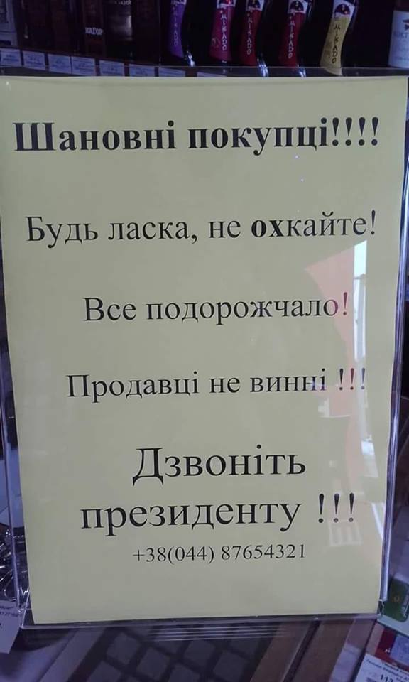 "Уважаемые покупатели! Пожалуйста, не охкайте! Все подорожало! Продавцы не виноваты! Звоните президенту!" – сказано в объявлении.