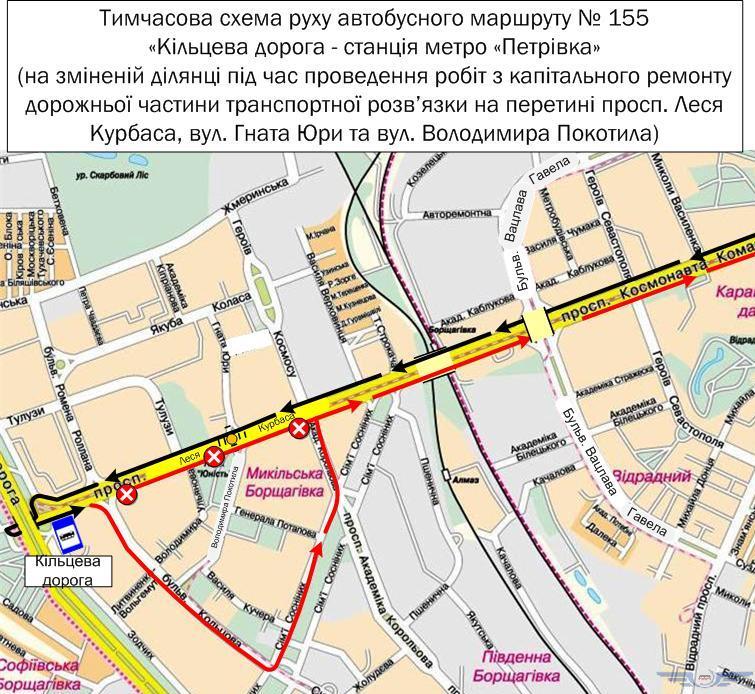 Автобусы № 155 в направлении станции метро "Почайная" поедут так: Кольцевая дорога — проспект Леся Курбаса — бульвар Кольцова — улица Семьи Сосниных — проспект Академика Королева — проспект Леся Курбаса, а потом по собственному маршруту.