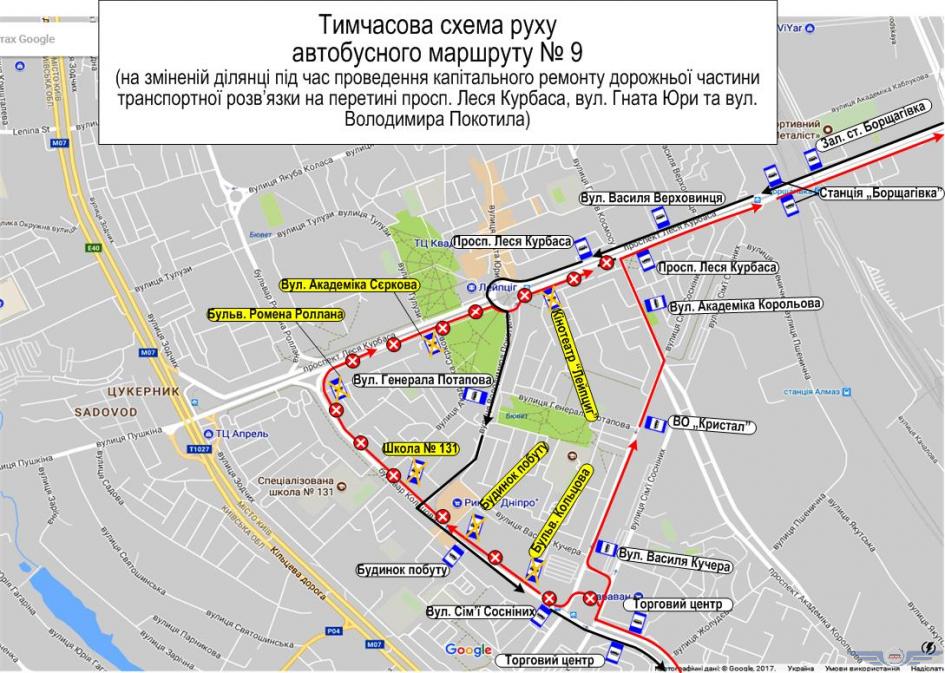 Автобусы № 9 будут курсировать так: от улицы Михаила Булгакова до улицы Симиренка по стандартному маршруту, а дальше от улицы Семьи Сосниных до проспекта Академика Королева, к проспекту Леся Курбаса и дальше по старой схеме.