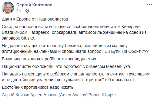 По его словам, радикалы обвинили женщину в том, что она спонсирует Россию, мешали ей оплатить бензин, обклеили всю машину агитационными наклейками и спрашивали - не была ли она на фронте. Женщина отметила, что ее в машине ожидает ребенок с инвалидностью и ей необходимо срочно ехать, но эти доводы никак не повлияли на националистов, которые продолжали блокировать работу АЗС и все попытки женщины оплатить топливо. Свои действия активисты объяснили "борьбой с бизнесом Медведчука".