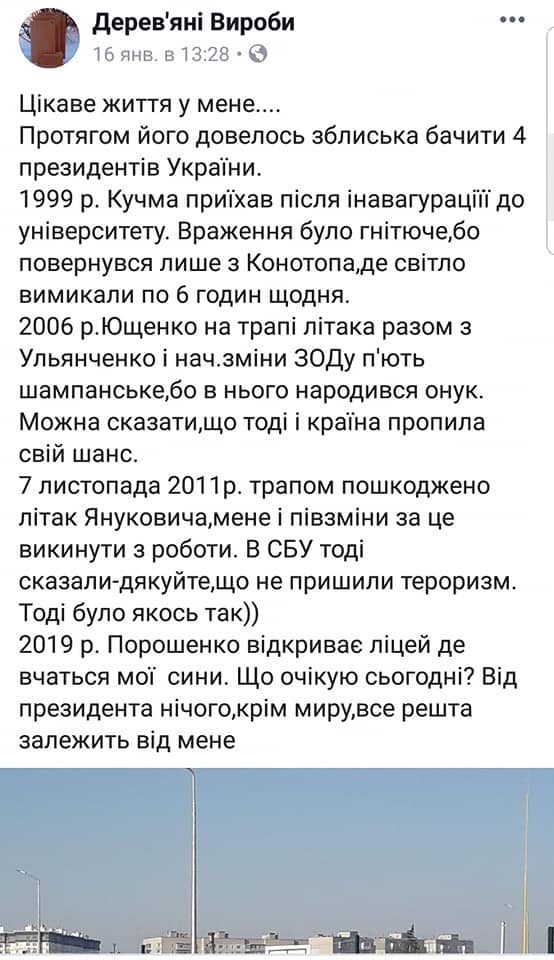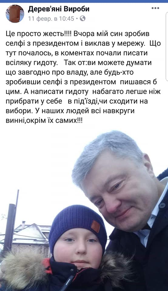 "Так вот: вы можете думать что угодно о власти, но любой сделав селфи с президентом гордился бы этим. А написать гадость намного легче, чем убрать у себя в подъезде или сходить на выборы. У наших людей все вокруг виноваты, кроме их самих", - отметил он на Facebook-странице "Деревянные изделия".