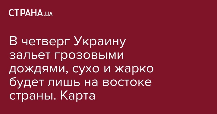 В четверг Украину зальет грозовыми дождями, сухо и жарко будет лишь на востоке страны. Карта