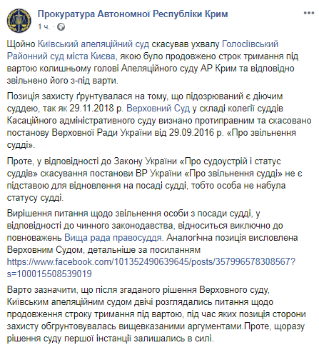 Позиция защиты бывшего председателя Апелляционного суда АР Крым Валерия Чернобука основывалась на том, что подозреваемый является действующим судьей, так как 29 ноября 2018 года Верховный суд в составе коллегии судей Кассационного административного суда признал противоправным и отменено постановление Верховной рады от 29 сентября 2016 года "Об увольнении судьи".