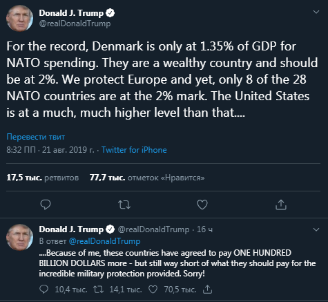 "К сведению, вклад Дании в НАТО составляет лишь 1,35% ВВП. Это богатая страна, и она должна выделять 2%. Мы защищаем Европу, но только 8 из 28 стран НАТО достигли отметки в 2%. Соединенные Штаты находятся на гораздо более высоком уровне, чем этот... Благодаря мне эти страны согласились заплатить сто миллиардов долларов - но все еще намного меньше того, сколько они должны заплатить за предоставленную невероятную военную защиту", - написал Дональд Трамп.