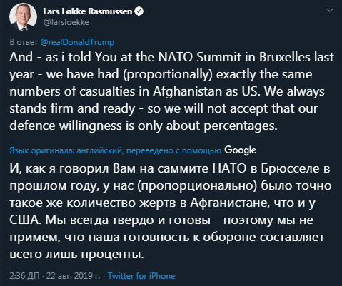 "У нас было (пропорционально) столько же жертв в Афганистане, сколько и у США. Мы всегда непреклонны и готовы. Мы не примем, что наша готовность к обороне - это только о процентах. Я говорил это вам на саммите НАТО в Брюсселе в прошлом году ", - написал Расмуссен в Twitter.