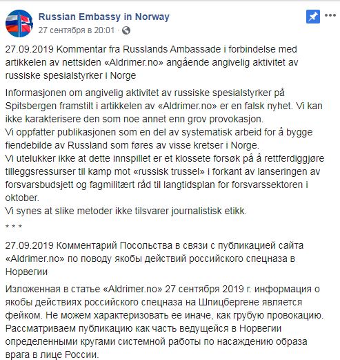 Посольство России в Осло назвало грубой провокацией статью интернет-издания. "Изложенная в статье Aldrimer.no 27 сентября 2019 года информация о якобы действиях российских спецназовцев на Шпицбергене является фейком. Мы не можем охарактеризовать ее иначе, как грубую провокацию", - заявило посольство на странице в Facebook.