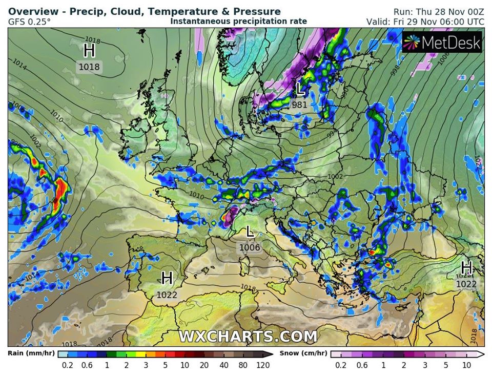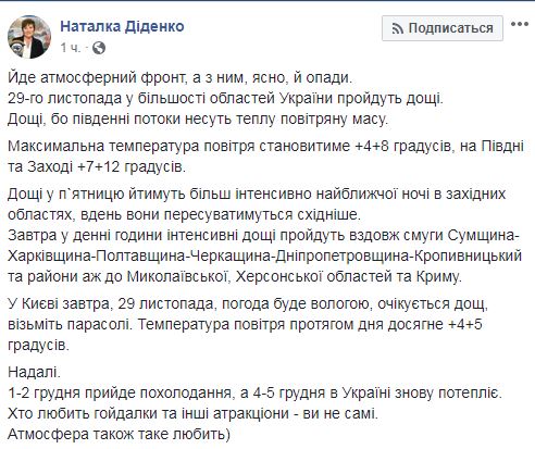 В Украине в пятницу, 29 ноября, ожидается дождливая погода. Об этом сообщила на своей странице в Facebook синоптик Наталья Диденко.
