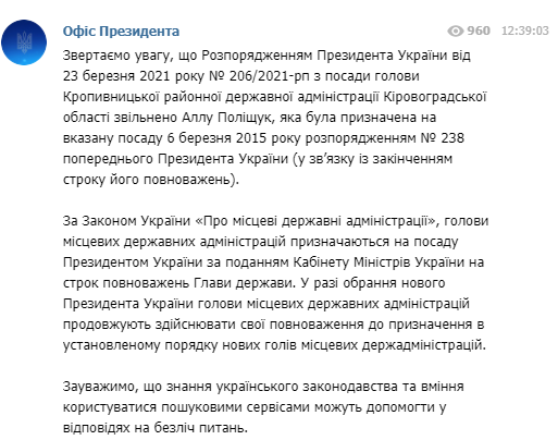 Речь идет о том, что на официальном сайте президента днем ранее опубликовали распоряжение Зеленского об увольнении Аллы Полищук с должности главы Кропивницкой районной государственной администрации Кировоградской области. При этом в тексте была допущена ошибка: в нем говорилось об окончании срока полномочий президента Украины.