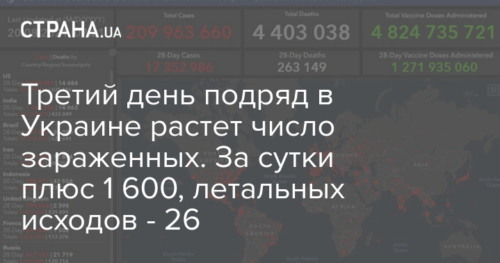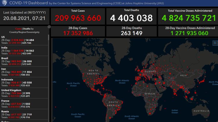 По последним данным университета имени Хопкинса (следит за ситуацией в разных странах в режиме мониторинга 24/7), на утро 20 августа отмечено уже 209 963 660 зараженных с момента начала пандемии, число жертв в глобальном масштабе выросло до 4 403 038.