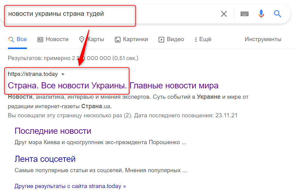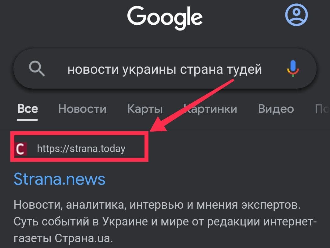 ШАГ 1. Напишите в поиске Google запрос новости Украины страна тудей, найдите ссылку в результатах поиска на новый адрес нашего сайта strana.today.