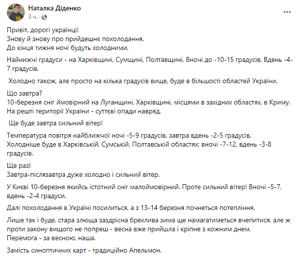 "Дальше похолодание в Украине усилится, а с 13-14 марта начнется потепление. Только так и будет, старая злющая завистливая лживая зима еще будет пытаться вцепиться, но против закона высшего не пойдешь - весна уже пришла и крепчает с каждым днем. Победа - за весной, наша", - добавила Наталья Диденко.