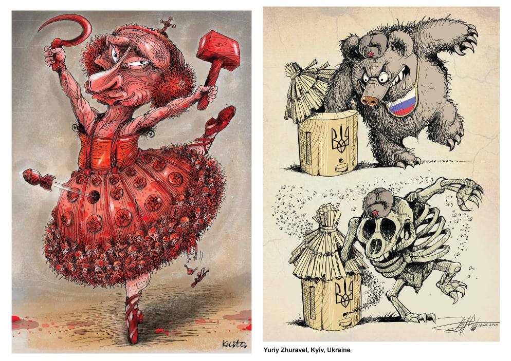 Большинство размещенных карикатур были взяты с выставки "Русский военный корабль, иди нах@й", проведенной в Одессе местной ассоциацией карикатуристов.