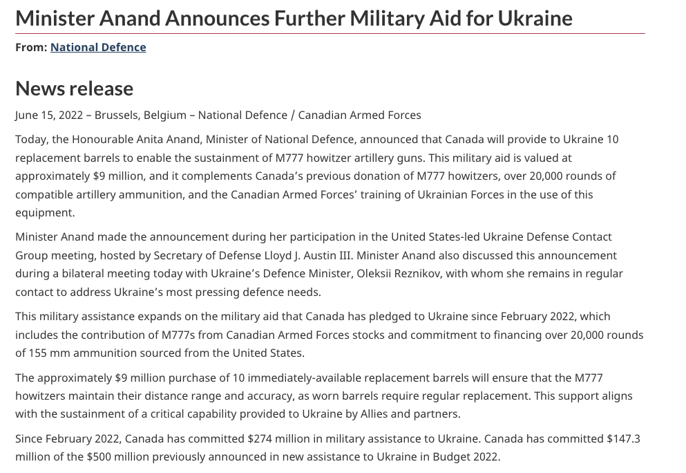 Ранее Канада закупила для Украины 20 тысяч артиллерийских снарядов калибра НАТО для гаубиц M777.