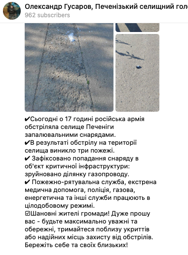 Сегодня вечером россияне обстреляли пгт Печенеги Чугуевского района Харьковской области зажигательными снарядами.