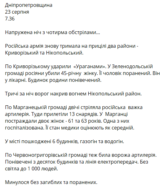 В ночь с 22 на 23 августа россияне четыре раза обстреляли Днепропетровскую область. В Криворожском районе погибла 45-летняя женщина, ее муж был ранен и попал в больницу. В Никопольском районе пострадали две женщины.