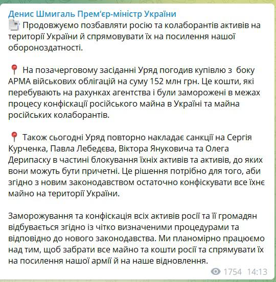 Это решение нужно для того, чтобы согласно новому законодательству окончательно конфисковать все их имущество на территории Украины, написал Шмыгаль.