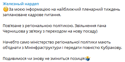 Нардеп Ярослав Железняк заявил, на ближайшей пленарной неделе в Раде запланировано "увольнение с должности министра".