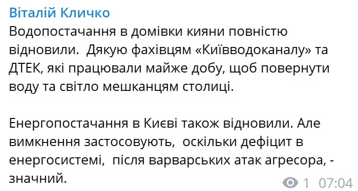 8:08 Кличко заявляет, что всем киевлянам вернули водоснабжение и электричество.