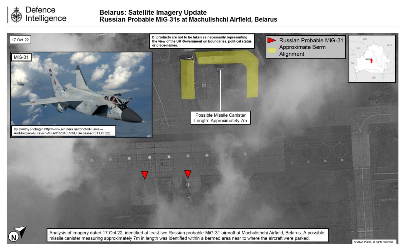"Вполне вероятно, что канистра связана с баллистической ракетой воздушного базирования AS-24 KILLJOY, крупногабаритным боеприпасом, для перевозки которого адаптирован вариант МиГ-31К", - говорится в сообщении разведки Великобритании.