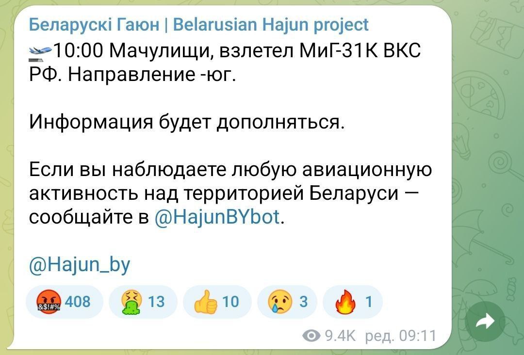 Также белорусская мониторинговая группа "Белорусский Гаюн" сообщила, что в аэропорту Мачулищи приземлился МиГ-31К. Он не совершал запусков.