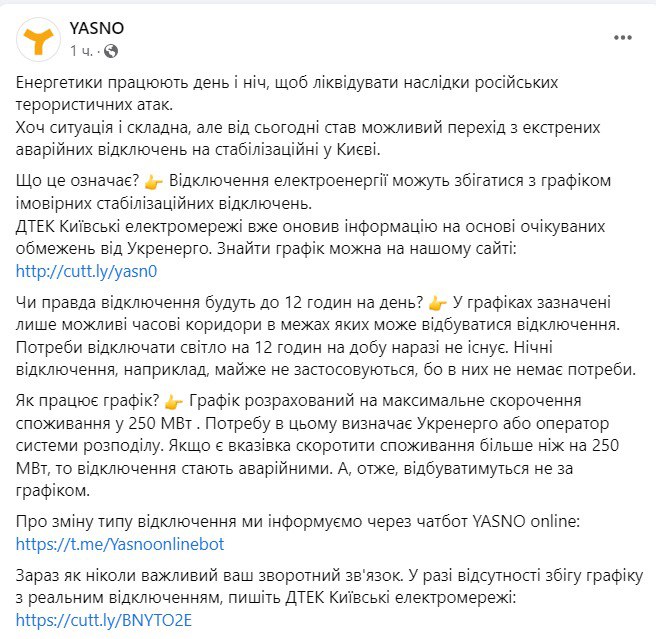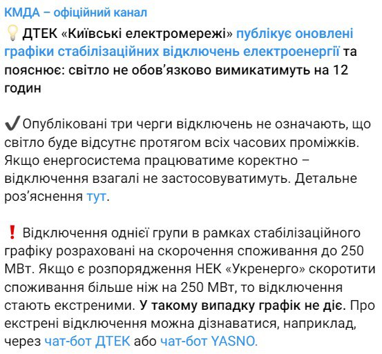 Но свет продолжат отключать, поскольку есть значительный дефицит в энергосистеме после ракетных ударов.