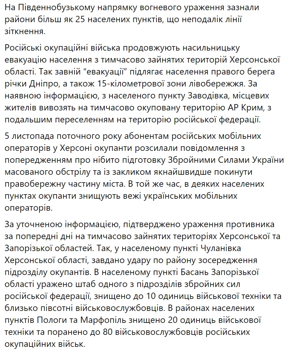 Также в сводке вновь говорится о насильственной эвакуации населения Херсонской области (правого берега Днепра, а также 15-километровой зоны левобережья). Сообщается, что абонентам российских мобильных операторов в Херсоне рассылали сообщения с предупреждением о якобы подготовке Вооруженными Силами Украины массированного обстрела и с призывом как можно быстрее покинуть правобережную часть города.