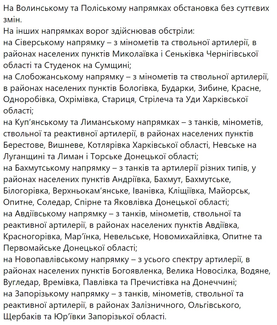 По данным ВСУ, в районах населенных пунктов Зыбино Харьковской области, Белогоровки Луганской области, Андреевки, Бахмутского, Берестового, Майорска, Макеевки, Марьинки, Озаряновки, Опытного, Павловки, Яковлевки и Ямполевки Донецкой области, а также в районе Щербаки Запорожской области украинские военные отразили атаки.