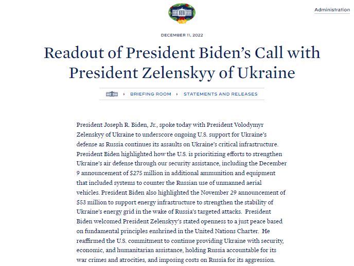 "Байден подчеркнул, что США уделяют приоритетное внимание усилиям по укреплению противовоздушной обороны Украины посредством помощи в области безопасности", - говорится в сообщении.