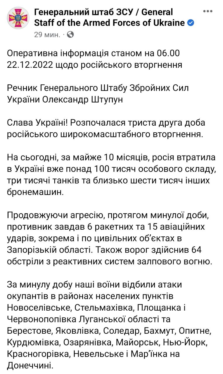 Утром в четверг, 22 декабря, Генштаб ВСУ опубликовал актуальную сводку о происходящем на фронте. Сообщается, что Россия потеряла в Украине более ста тысяч личного состава, трёх тысяч танков и шести тысяч бронемашин.