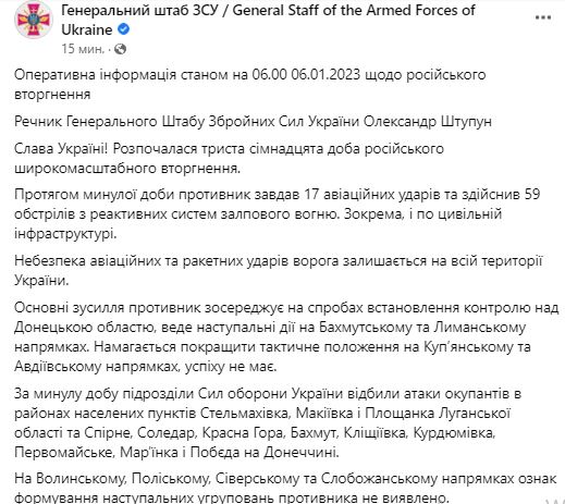 Утром, 6 января, Генштаб ВСУ обнародовал сводку о ситуации на фронте.