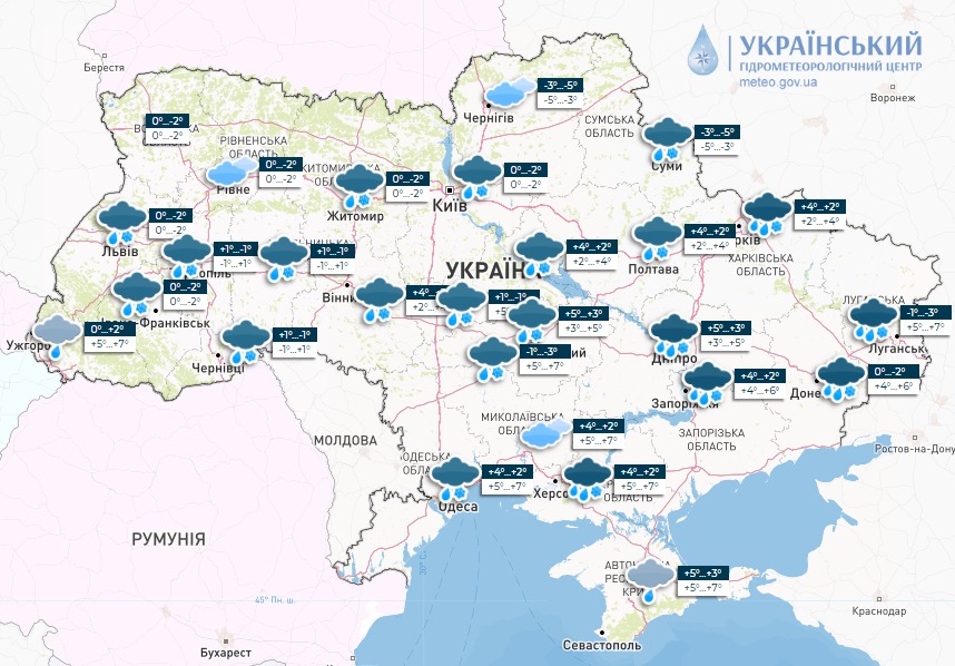 Ночью небольшой дождь с переходом в мокрый снег, был в юго-восточной части и в большинстве западных областей. Днем небольшие осадки обещают на севере Украины.