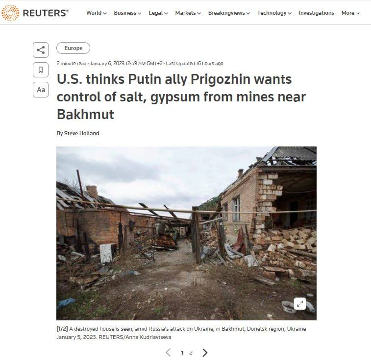 Так, неназванный официальный представитель Белого дома сообщил Reuters, что власти США объясняют нацеленность Пригожина на Бахмут желанием взять под контроль соляные и гипсовые месторождения в Донецкой области.