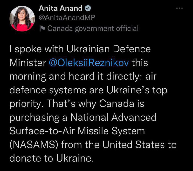 "Это первое бесплатное предоставление Канадой системы противовоздушной обороны Украины. В условиях жестоких воздушных ударов России по Украине эта система противовоздушной обороны поможет защитить украинские населенные пункты и объекты критической инфраструктуры от атак беспилотников, ракет и самолетов", - подчеркнула глава канадского Минобороны.