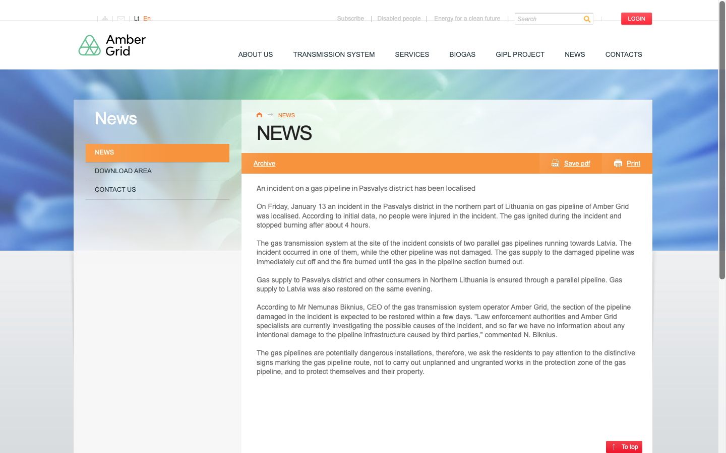 Известно, что газопровод используется для подачи газа в северную часть Литвы и для транспортировки газа в Латвию. Компания Amber Grid, которая обслуживает газопровод, в срочном порядке проинформировала правительство о сложившейся ситуации.