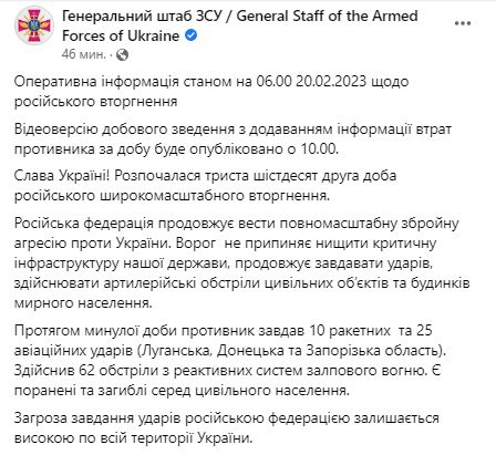 Утром 20 февраля Генштаб ВСУ обнародовал сводку о ситуации на фронте.