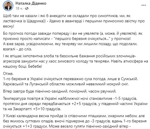 Синоптик Наталья Диденко пишет, что 1 марта в Украине ожидается преимущественно сухая погода, только в Сумской, Харьковской и Луганской областях возможен небольшой мокрый снег.