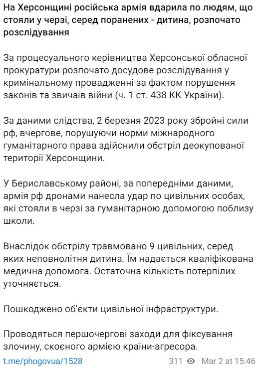 Она пишет, что попали в очередь людей, которые стояли за гуманитарной помощью возле школы. Среди раненых - несовершеннолетний ребенок.
