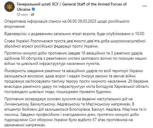 В среду, 29 марта, Генштаб ВСУ опубликовал сводку о ситуации на фронте.