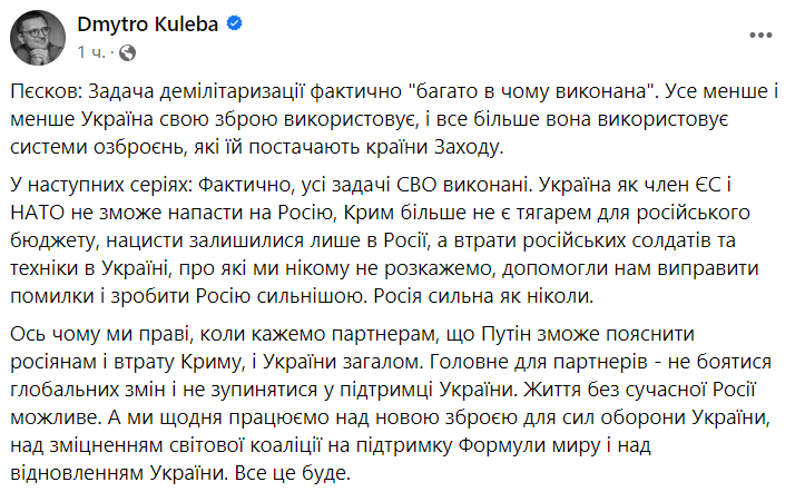 Министр иностранных дел Дмитрий Кулеба отреагировал на заявление пресс-секретаря президента РФ Дмитрия Пескова о выполнении одной из задач вторжения - "демилитаризации" Украины.